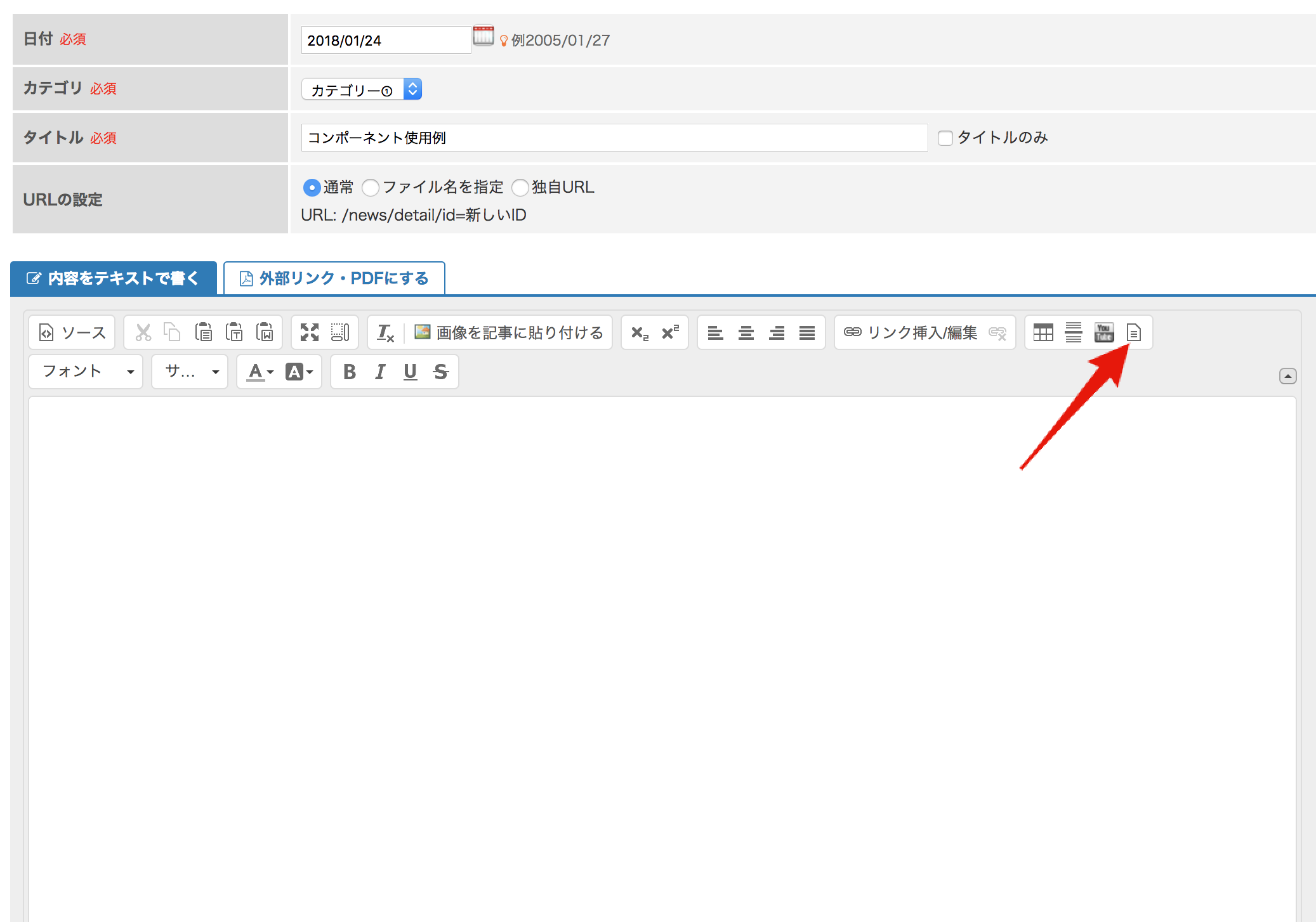 2018.01.24 カテゴリー① コンポーネント使用例 自由HTMLに登録したコンポーネントの呼び出し方 WYSIWYG内でコンポーネントを使用する コンポーネント一覧が開くので使用するコンポーネントを選択 WYSIWYG内に挿入されました インライン要素を改行する場合はshift+enter ブロック要素を改行する場合は赤い矢印を押下 ブロックの下の方にカーソルを合わせると赤い矢印が表示されました 赤い矢印を押下すると改行されました WYSIWYG内にコンポーネント用のスタイルを適用する contentsCssにスタイルシートのパスを指定 記事グループの設定画面で「本文の入力方法」のwysiwyg_optionsの入力欄に「contentsCss::読み込ませたいスタイルシートのパス」を指定してください。 拡張のWYSIWYG内にコンポーネント用のスタイルを適用する場合も個別に設定 ニュース一覧へ戻る